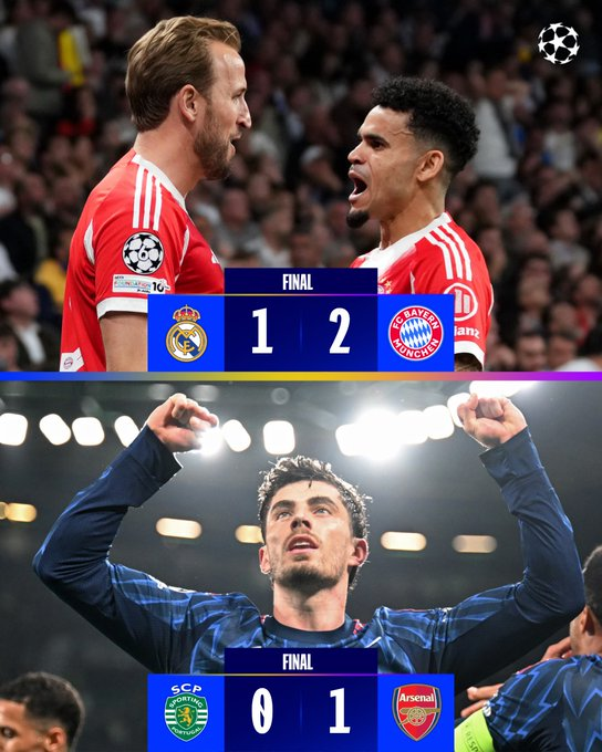 Bayern Munich derrotó 2-1 al Real Madrid en el Santiago Bernabéu.y el Arsenal 1-0 al Sporting de Lisboa en Portugal abriendo los duelos de ida.