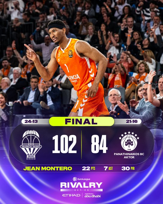 Jean Montero lideró a seis jugadores del Valencia con dobles dígitos, con 22 puntos y 7 asistencias, mientras que Nate Reuvers aportó 16 puntos y Brancou Badio 14. El Panathinaikos solo logró un empate en la doble jornada, cayendo a un balance de 21-16 a pesar de los 19 puntos de Nigel Hayes-Davis y los 8 puntos de Kendrick Nunn.