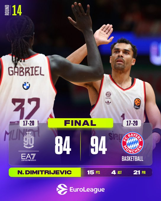 El Bayern estuvo a punto de desperdiciar una ventaja de 26 puntos, pero se lució en la recta final después de que el Milán redujera un déficit de 45-71 en el tercer cuarto a tan solo 75-79. Ambos equipos tienen un balance de 17-20 tras este resultado, ya que el Bayern ganó cinco de sus últimos seis partidos contra el Milán, mientras que el equipo italiano sufrió su quinta derrota en la Euroliga en los últimos seis encuentros. Ninguno de los dos equipos tiene posibilidades de clasificarse para los playoffs.