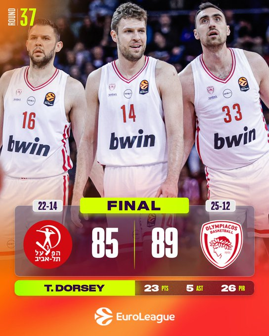 El Olympiacos se aseguró la ventaja de jugar en casa en los playoffs al vencer al Hapoel por 85-89 en el Arena 8888 de Sofía. Los locales comenzaron con fuerza con una racha inicial de 10-0, pero los Rojos respondieron con una racha de 0-15 para ponerse arriba 18-22 después de 10 minutos. El partido se convirtió en un constante intercambio de canastas en el segundo cuarto, con el Olympiacos manteniendo una ventaja de 48-51 al descanso. Las defensas se reforzaron en la segunda mitad y los visitantes limitaron al Hapoel a menos de 20 puntos en cada uno de los dos últimos cuartos para conseguir su quinta victoria en seis partidos.