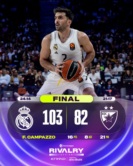 Mario Hezonja lideró al equipo ganador con 19 puntos. Facu Campazzo sumó 16 puntos y 6 asistencias, Theo Maledon anotó 12, mientras que Usman Garuba y Andrés Feliz anotaron 10 cada uno para el Real Madrid, que tenía un récord de 17-1 y ganó sus últimos 14 partidos como local en el Movistar Arena. Jordan Nwora lideró al Real Madrid con 15 puntos. Chima Moneke agregó 14, mientras que Jared Butler, Ognjen Dobric y Ebuka Izundu anotaron 10 cada uno para el Real Madrid. El Real Madrid construyó una ventaja de doble dígito, 56-44, al medio tiempo, la extendió a 85-65 con más de 7 minutos restantes y se encaminó a una importantísima victoria en casa.