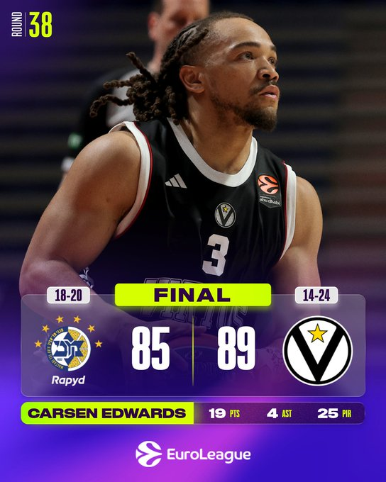 Virtus cerró la temporada con broche de oro al derrotar a Maccabi por 85-89 en Belgrado. El primer cuarto fue muy disputado, sin que ninguno de los equipos lograra dominar, y Virtus se puso arriba 14-16. Una ráfaga anotadora de Derrick Alston impulsó a los visitantes a una ventaja de dos dígitos, que Maccabi redujo a 36-40 al descanso. Carsen Edwards anotó 10 puntos en el tercer cuarto para mantener a Virtus arriba 62-69. Los locales siguieron presionando en el último periodo y se mantuvieron en la lucha, pero el equipo italiano se mantuvo firme en los momentos clave para llevarse la victoria.