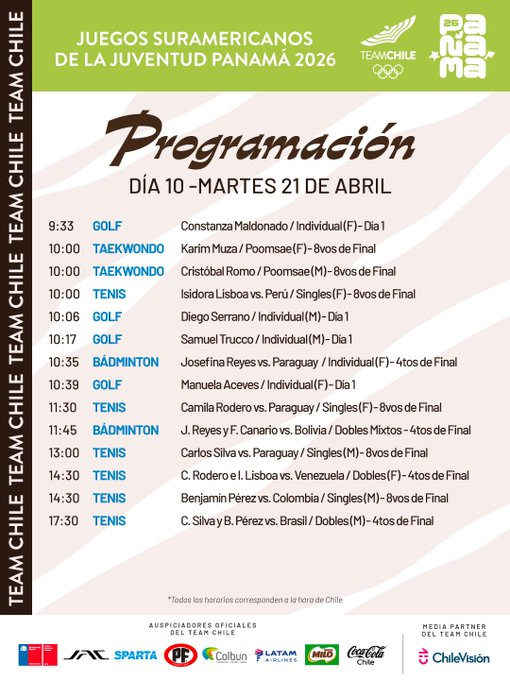 Este martes 21 de abril continúa la acción en los IV Juegos Suramericanos de la Juventud Panamá 2026, con una jornada variada que reúne varias disciplinas tras un lunes sin entrega de medallas