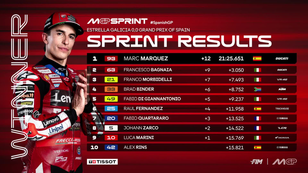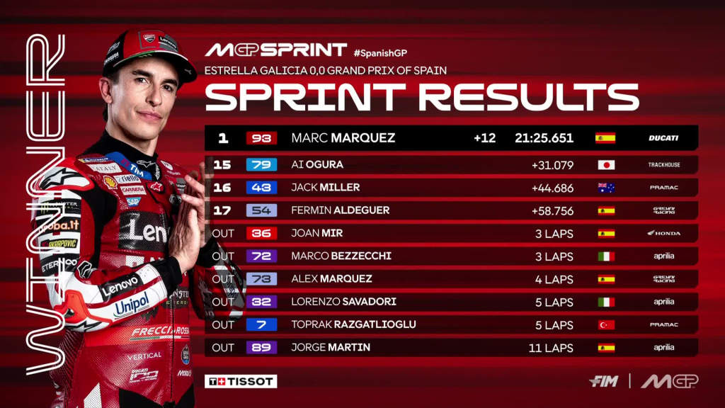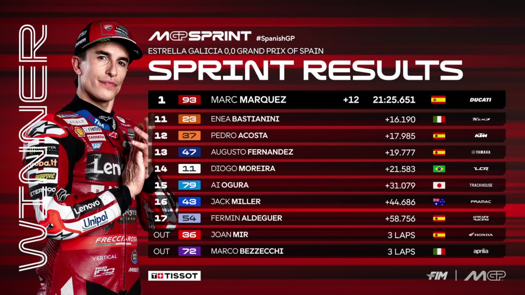 piloto español Marc Márquez ha sido el ganador de la carrera sprint del Gran Premio de España de MotoGP a pesar de sufrir una caída, una prueba con la lluvia como invitada principal en la primera carrera del Mundial en Europa disputada en el circuito de Jérez, donde Marco Bezzechi y Jorge Martín, no han logrado puntuar tras sufrir sendas caídas.