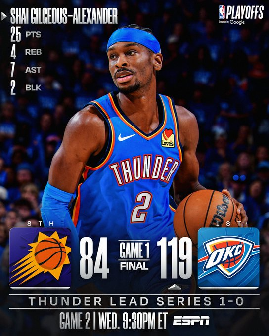 En tanto Oklahoma City Thunder, vigente campeón de la NBA y dueño del mejor récord de la temporada regular (64-18), comenzó los playoffs con una actuación contundente. En el Paycom Center, se impuso con autoridad por 119 a 84 ante los Phoenix Suns y se adelantó 1 a 0 en la serie de primera ronda del Oeste, reafirmando su condición de máximo candidato al título.