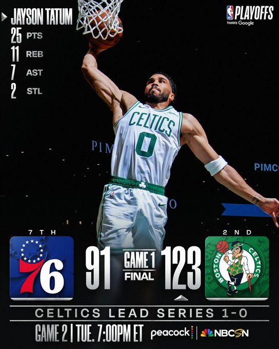 Boston arrancó con todo en los playoffs y pasó por encima a Philadelphia por un resultado de 123 a 91, poniendo la serie 1 a 0. En el elenco ganador hubo una gran actuación de Jayson Tatum (25 puntos, 11 rebotes y 7 asistencias) y de Jaylen Brown (26 tantos). En los Sixers, el más destacado fue Tyrese Maxey, con 21 puntos y 8 asistencias.