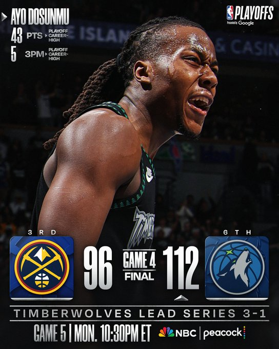 Ayo Dosuunmu fue la enorme figura con 39 puntos, seguido por 17 de Naz Reid y 15 de Julius Randle. En los Nuggets no alcanzaron los 30 puntos de Jamal Murray y los 22 más 15 rebotes y 9 asistencias de Nikola Jokic.
