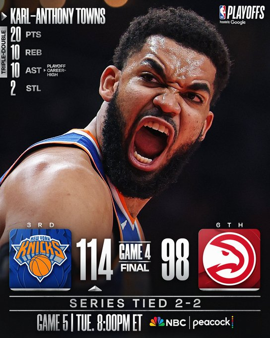 Los Knicks vencieron a Atlanda y empatan la serie 2 a 2, y los Timberwolves derrotaron a Denver y se ponen 3-1 arriba