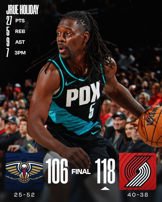 Jrue Holiday anotó 27 puntos, incluyendo siete triples, y los Blazers derrotaron a New Orleans por 118-106, ante la atenta mirada de los nuevos dueños de Portland. Deni Avdija aportó 26 puntos para los Blazers, que acumulan tres victorias consecutivas y ocho de sus últimos diez partidos. Toumani Camara finalizó con 23 puntos.