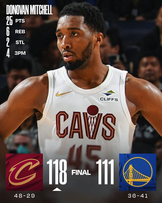 Donovan Mitchell anotó 25 puntos y capturó seis rebotes, un triple de Max Strus (24 puntos) a 54 segundos del final selló la victoria, anotando 24 puntos, y los Cavaliers derrotaron a Golden State 118-111. James Harden aportó 19 puntos y cinco asistencias en la séptima victoria de los Cavs en nueve partidos, en una racha de cinco encuentros en ocho noches. Los Warriors siguieron sufriendo la ausencia de Curry, que no juega desde el 30 de enero y se perdió 27 partidos seguidos. Hoy definirán si vuelve mañana ante los Rockets.