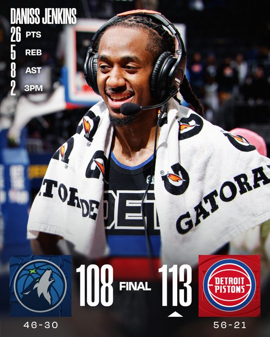 Jalen Duren anotó 22 puntos y capturó 14 rebotes, Daniss Jenkins anotó 26 puntos y los Pistons vencieron a los Timberwolves 113-108, en un partido en el que ambos equipos jugaron sin su superestrella. Minnesota descartó a Anthony Edwards por una lesión en la rodilla derecha y una enfermedad 90 minutos antes del inicio del partido. Los Pistons habían anunciado ese mismo día que Cade Cunningham estaría de baja al menos una semana más para recuperarse de su enfermedad pulmonar. Los Pistons, campeones de la División Central, intentan mantenerse por delante de Boston para conseguir la primera posición en los playoffs de la Conferencia Este.