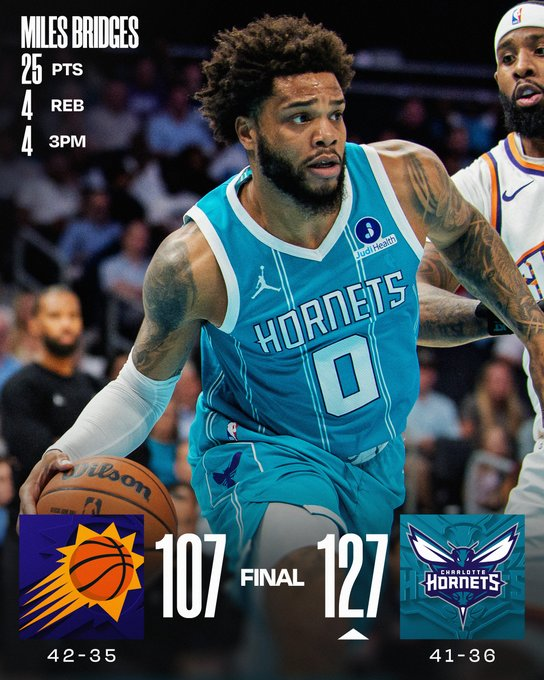 Los Hornets no tuvieron problemas para despachar a Phoenix por 20 de locales con 25 de Bridges y 20 de Kueppel, que al meter 4 triples rompió el récord de la franquicia en una temporada (261). Phoenix arrancó mejor, pero desde el segundo cuarto en adelante fue todo de los Hornets.