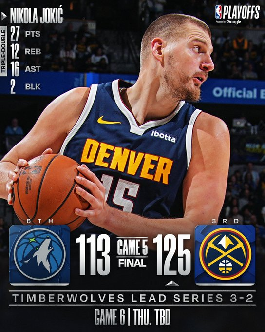 Denver tenía la chance de descontar y volver a la serie, y lo hizo de menor a mayor. Fue triunfo de los Nuggets por 125-113 ante los Timberwolves para poner el 3-2 y forzar un 6º partido.