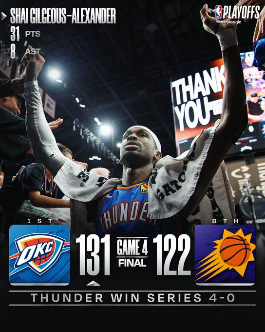 El Thunder sacó la escoba y barrió la serie para llegar a semifinales. Fue triunfo de OKC por 131-122 frente a Phoenix como visitante para clasificarse a semifinales del Oeste con un 4-0 contundente.