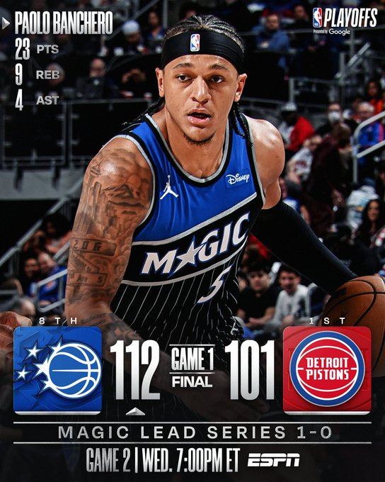 Orlando Magic se transformó en el primer equipo en robar un partido como visitante en los presentes playoffs. El equipo de Florida le ganó a los Pistons en su casa por 112 a 101. La figura del conjunto ganador fue Paolo Banchero, con 23 puntos y 9 rebotes. Wagner (19), Carter Jr. (17), Bane (17) y Suggs (16) también tuvieron grandes producciones. En los Pistons se destacó Cade Cunningham, que finalizó con 19 puntos, 5 rebotes y 4 asistencias.