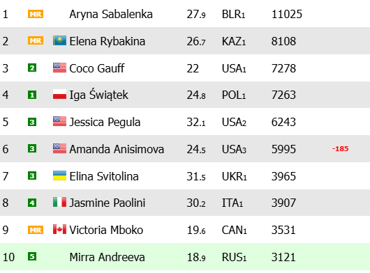 A destacar la defensa del título de Jessica Pegula que la mantiene en 5ª posición con 6.243 puntos), mientras que Marie Bouzkova (1.676 puntos) consigue su mejor puesto (24ª clasificada) tras su título en el WTA Bogotá 2026.