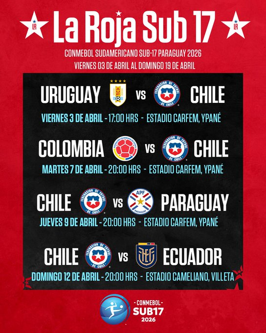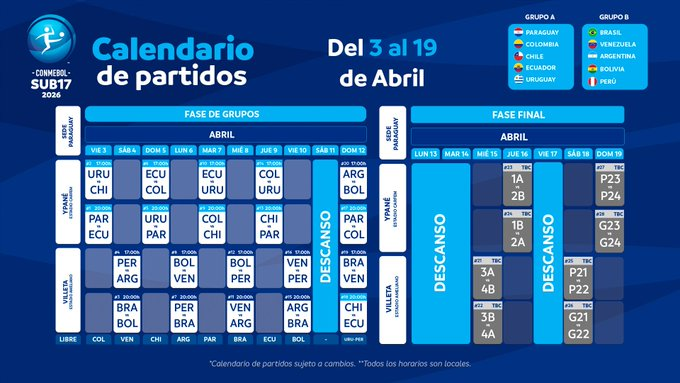 La CONMEBOL Sub-17 2026 comenzará este viernes 03 de abril en Paraguay, con partidos en el Estadio CARFEM (Ypané) y el Estadio Ameliano (Villeta), sedes de la Fase de Grupos y la Fase Final y se desarrollará hasta el 19 de abril en las localidades de Ypané y Villeta – Paraguay.